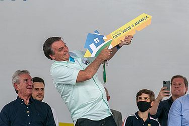Cumprindo o primeiro ponto de usa agenda em Alagoas no maior bairro da capital alagoana, o presidente Jair Bolsonaro (sem partido) chegou ao Benedito Bentes para a entrega de 500 unidades habitacionais do Residencial Oiticica I, por meio do Programa Casa Verde e Amarela.