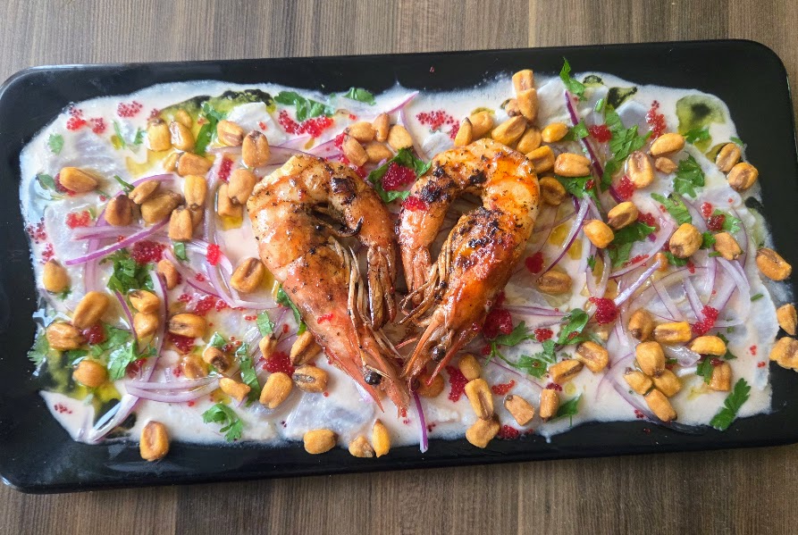 O Tiradito de Robalo, marinado em leite de tigre de coco verde e finalizado com tobiko (ovas de peixe), se destaca como uma entrada delicada e memorável, com equilíbrio entre acidez, o leve dulçor do coco e sabor intenso.