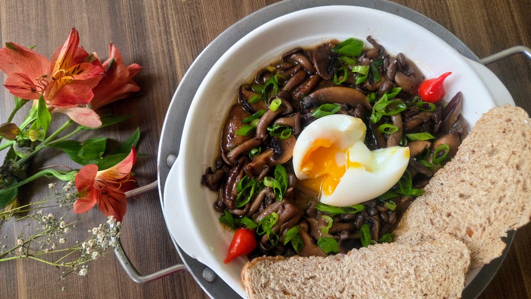 O menu contempla ainda quem busca opções vegetarianas, como o Trio de Cogumelos na manteiga, acompanhado de ovo mollet e pão rústico — uma entrada leve e reconfortante.