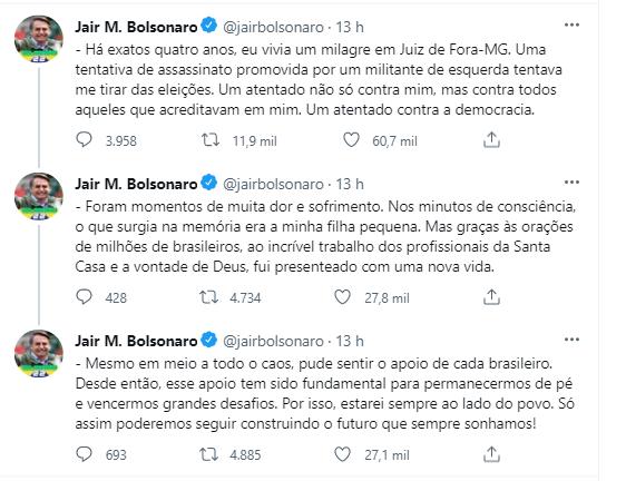 "Há exatos quatro anos, eu vivia um milagre em Juiz de Fora-MG. Uma tentativa de assassinato", disse Bolsonaro. Veja o post na íntegra: (...) Um atentado não só contra mim, mas contra todos aqueles que acreditavam em mim. Um atentado contra a democracia." Em três mensagem (leia abaixo), ele citou às orações de apoio e o trabalho da equipe médica que o socorreu. "Fui presenteado com uma nova vida".