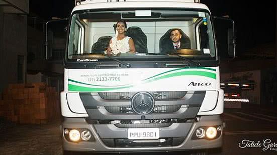 No dia do “Sim”, Neyrielen chegou na igreja a bordo de um caminhão de lixo. Eu não esperava menos do que isso! haha