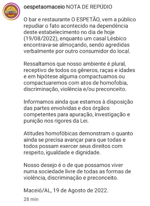 Na data em que é comemorado o Dia do Orgulho Lésbico, nesta sexta-feira, 19, a advogada Brunna Quintiliano e a namorada dela foram constrangidas e tiveram que ouvir de um homem que ele sentia "nojo" do casal simplesmente porque as duas trocaram um abraço enquanto aguardavam o almoço que haviam acabado de pedir. O TNH1 apurou que o homem é coronel da reserva da Polícia Militar de Alagoas (PM-AL).