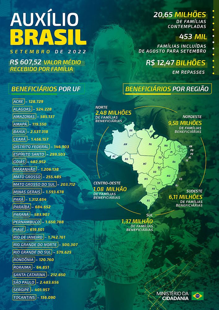 O Nordeste concentra o maior número de famílias contempladas pelo Auxílio Brasil em setembro de 2022. Das 20,65 milhões de famílias beneficiadas pelo programa permanente de transferência de renda no país, 9,58 milhões estão na região. O investimento do Ministério da Cidadania para o pagamento dos beneficiários do Nordeste é de R$ 5,77 milhões e o valor médio recebido por família é de R$ 607,50.