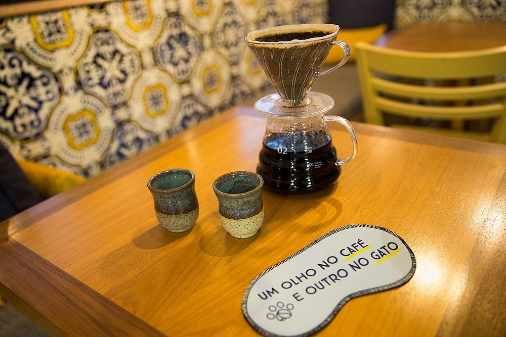 Um fator que dificultou a vinda do modelo para cá foi a legislação sanitária brasileira, que proíbe que animais fiquem no mesmo local onde alimentos são servidos. A solução foi criar um ambiente separado da cafeteria para abrigar os bichanos.
