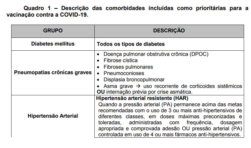 "Estão definidas como elegíveis à priorização para a vacinação contra a Covid-19, conforme o Plano Nacional de Operacionalização da Vacinação, os seguintes grupos de comorbidades: diabetes mellitus, pneumopatias crônicas graves, hipertensão arterial em diferentes condições, doenças cardiovasculares, doenças cerebrovasculares, doença renal crônica, imunossupprimidos, anemia falciforme, obesidade mórbida, síndrome de Down e cirrose hepática", traz a nota técnica.