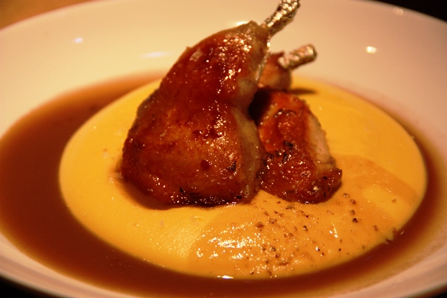 O prato principal sempre oferece duas opções, a exemplo do galetinho no molho de ervas com purê de mandioquinha envolvido no próprio caldo da galinha, produzido na própria na casa, com clássica receita de cozinhar a carcaça no vinho tinto, com alecrim, tomilho, cenoura e alho. A carne macia e bem crocante é apenas temperada no sal, pimenta do reino e ervas. O caldo vem ao redor do purê, conferindo sabor aromático a iguaria. Todos os caldos são preparados na cozinha do chef Jonatas .