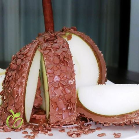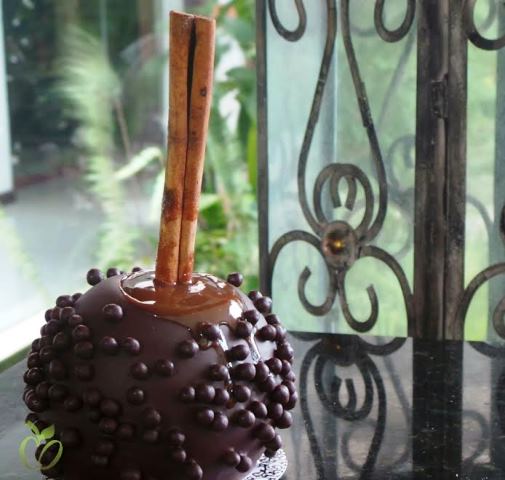 Maçã com chocolate belga meio amargo e crocantes de chocolate amargo