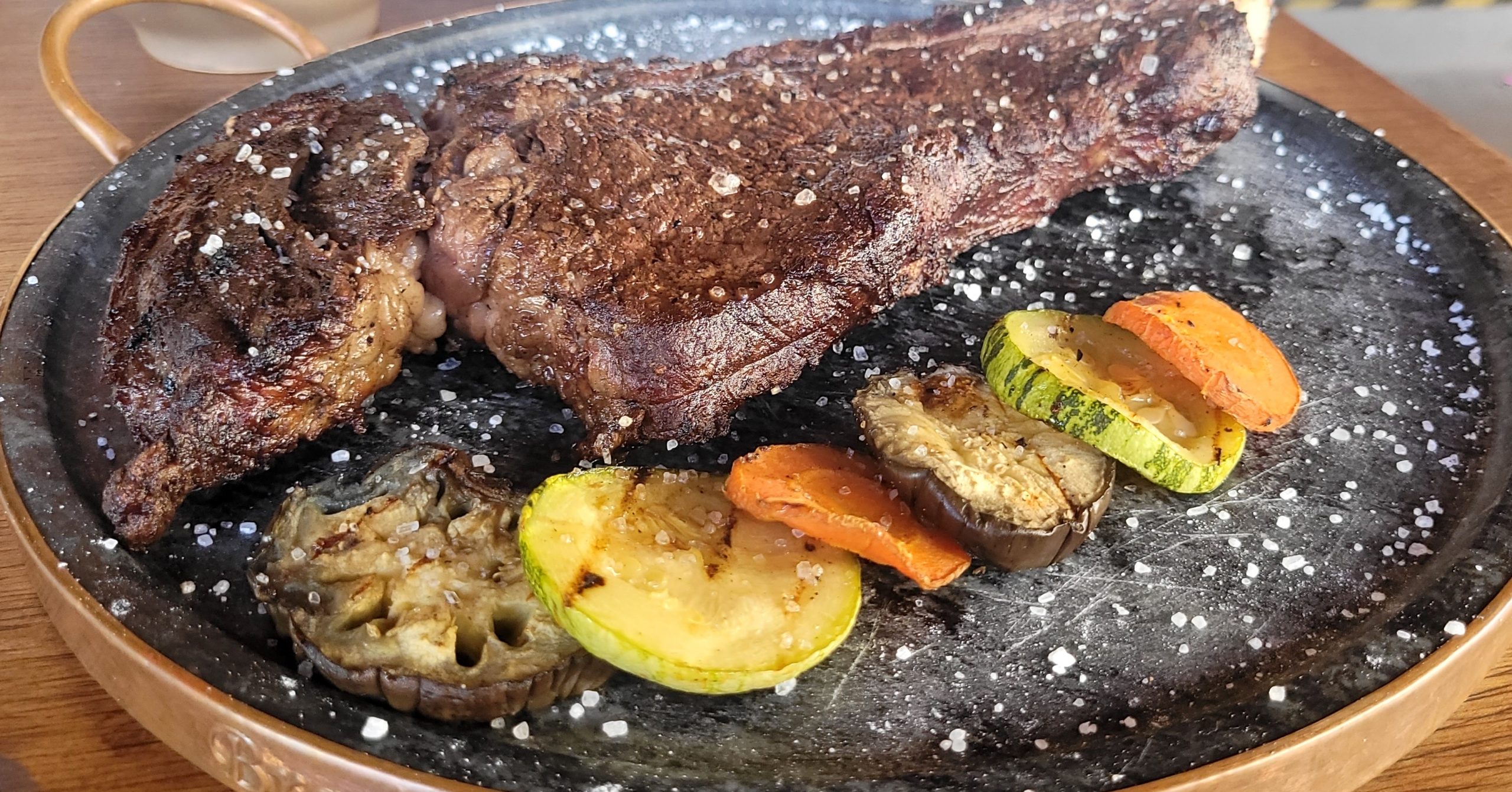 Para duas pessoas ficarem felizes, indico o short ribs (aproxidamente 800g). É um corte do miolo do acém, super macio e polvilhado com sal grosso. O prato principal dá direito a vinagrete, farofa e mais dois acompanhamentos que fica a critério do freguês. Eu investi na macaxeira cozida e feijão verde, claro, pedi manteiga de garrafa, e prontamente fui atendida.