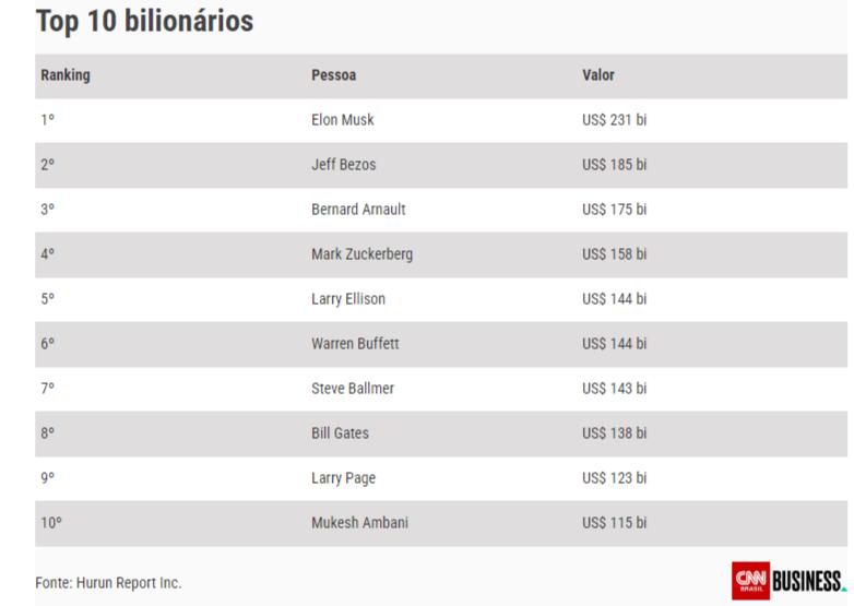 Elon Musk, da Tesla, figurou no primeiro lugar da lista dos 10 mais bilionários do mundo, com US$ 231 bilhões, seguido de Jeff Bezos, da Amazon, com US$ 185 bilhões.