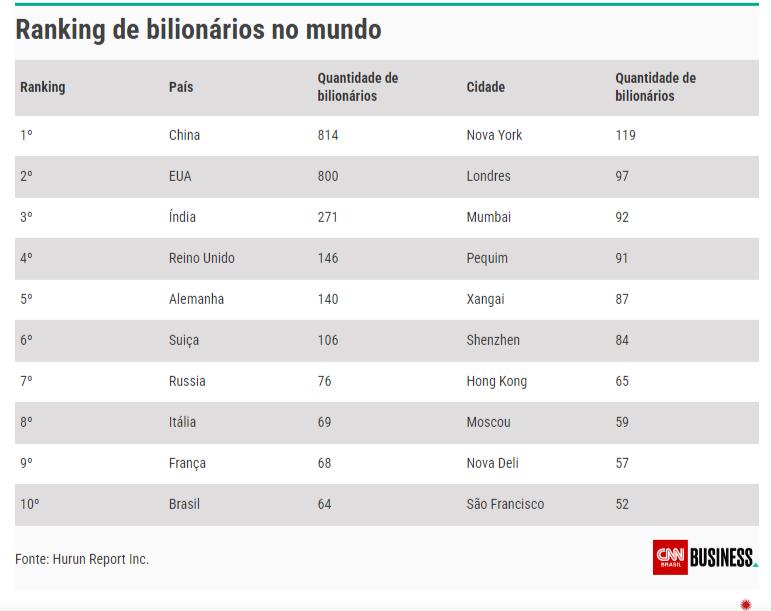 A China continua liderando o ranking, mesmo após perder 155 bilionários, chegando a 814 pessoas com ao menos US$ 1 bilhão, seguido dos EUA e Índia.