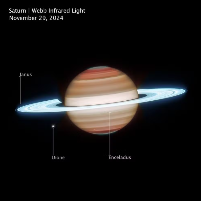 Os famosos anéis de Saturno aparecem com um nível de detalhe impressionante. Eles são formados principalmente por gelo de água, que reflete intensamente a luz solar. Por isso, brilham muito mais nas imagens em infravermelho do Webb.