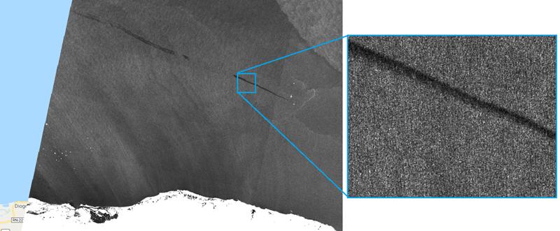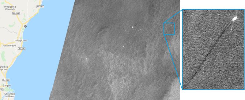 Ele destaca que, nas duas imagens do satélite Sentinel-1A, há sinal de navios próximos da grande mancha de derramamento de óleo detectada. Essa particularidade do registro contribui muito com as investigações.