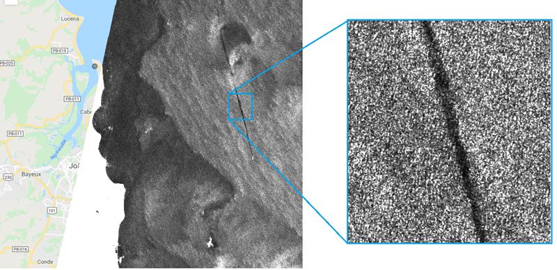 O satélite capturou uma grande mancha de óleo no mar, com cerca de 25 km de extensão e 400 metros de largura. A mancha pode ser bem maior, pois parte dela talvez não tenha sido registrada pela faixa de cobertura do satélite.