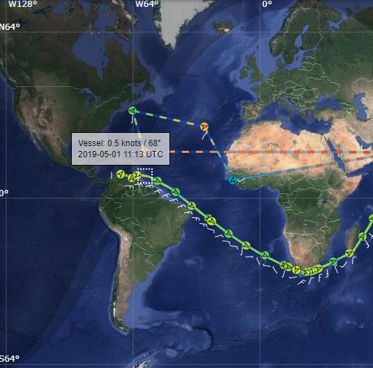 A imagem acima mostra dois itinerários do navio, em maio e em julho de 2019. O navio costumava fazer o trajeto de um país asiático até a Venezuela, pela África do Sul, com o transponder devidamente ligado, ou seja, o aparelho que indica sua localização durante todo o percurso.
