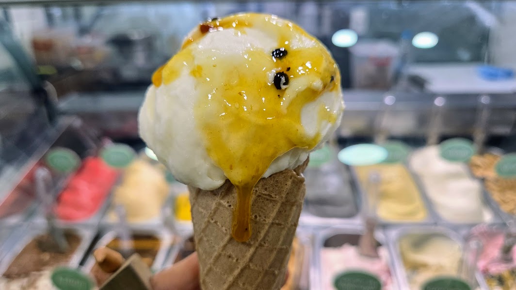 Já o sorvete de coco com geleia de maracujá é uma proposta saborosa para quem tem restrições alimentares, como diabetes ou intolerância à lactose, e também para quem é vegano — não tem nada de origem animal. Perfeito. E tem mais: casquinha vegana, sem açúcar e sem lactose. Bom demais!