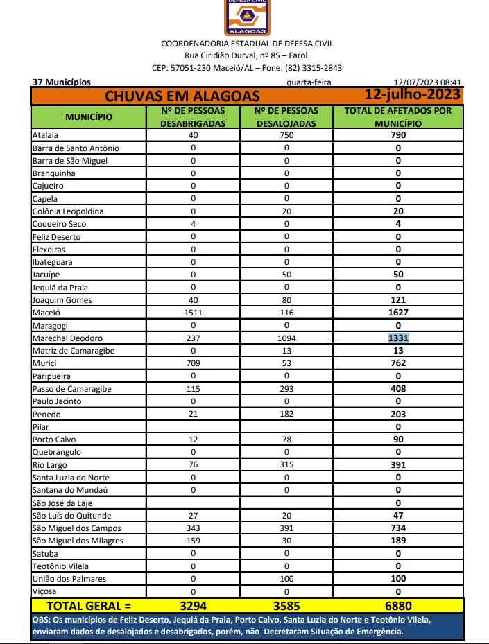 Em boletim divulgado na manhã desta quarta-feira (12), a Coordenadoria Estadual de Defesa Civil de Alagoas atualizou o número de desabrigados e desalojados no estado, que baixou para 6.880.