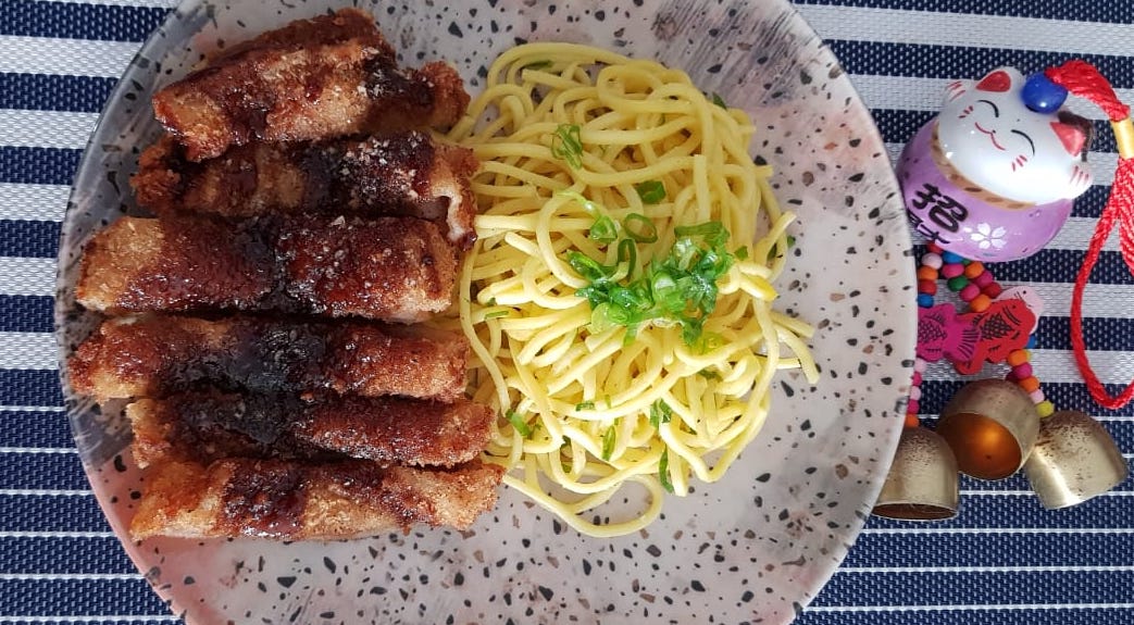 Filezinho de porco empanado ao molho tonkatsu, acompanhado de uramaki de kani, macarrão ao alho e óleo, e rolinho de goiabada