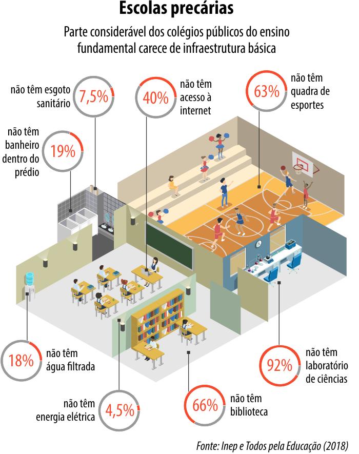 As verbas também se mostram insuficientes quando são listados os problemas que elas ainda não conseguiram resolver. A cada dez pré-escolas públicas, oito não contam com sala de leitura e sete não têm parquinho. No 3º ano do ensino fundamental, metade dos alunos não faz contas básicas nem lê de modo satisfatório. Dos adolescentes que deveriam estar cursando o ensino médio, 900 mil se encontram fora da escola. Insuficientes, as unidades de ensino de tempo integral só recebem 15% dos alunos da rede pública — a maior parte tem apenas quatro horas de aula por dia.