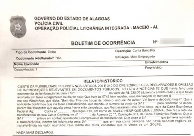 Foi o que aconteceu com a alagoana Simone Ferro, vítima do golpe na última semana. Ela havia encomendado um serviço e teria que transferir o valor de R$ 230 para uma mulher, referente ao pagamento, no dia 6 de dezembro. No início da manhã desse dia, Simone recebeu esta mensagem: “Bom dia, tive que trocar de número, esqueci de avisar. Vai fazer o depósito hoje?”.