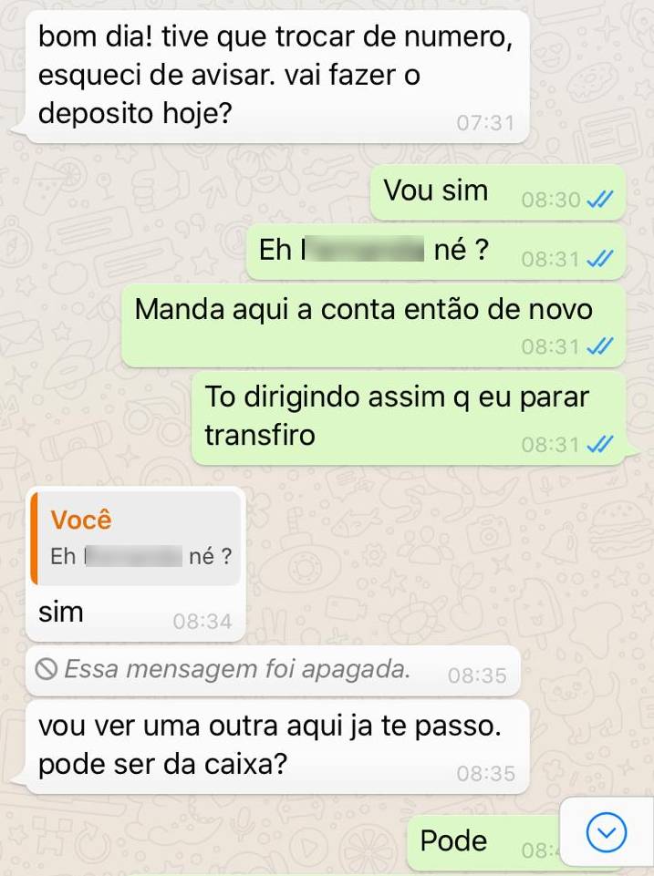 Em vários casos já relatados, a vítima recebe uma mensagem por Whatsapp de uma pessoa que se passa por conhecida dela e que utiliza o código de telefone do mesmo estado para não gerar desconfiança. O estelionatário cobra o depósito do dinheiro que já teria sido combinado anteriormente e quem tem alguma negociação inacabada termina sendo presa fácil para o bandido.