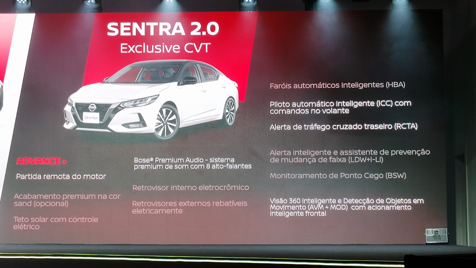 Além do design marcante e proporções que o diferenciam no seu segmento, o Novo Nissan Sentra destaca-se pelos equipamentos de série inéditos entre os modelos com três volumes. Somente o sedã da Nissan oferece aos brasileiros itens como Visão 360º Inteligente e Detecção de Objetos em Movimento (AVM + MOD), Alerta de Tráfego Cruzado Traseiro (RCTA), Alerta Inteligente de Atenção do Motorista (I-DA), Bancos com Tecnologia Zero Gravity®, Controle Dinâmico de Chassi Integrado, Partida Remota do Motor e sistema premium de som BOSE® com 8 alto-falantes.