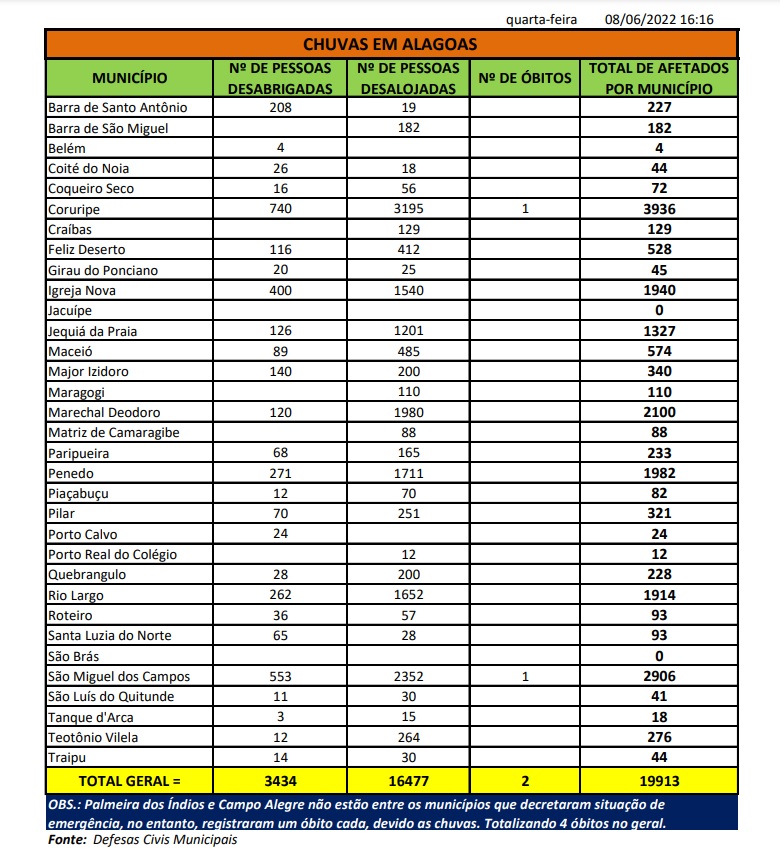 A população de Coruripe é a mais afetada atualmente, com um total de 3.936 pessoas nesta situação. São Miguel dos Campos, Penedo, Rio Largo, Jequiá da Praia e Igreja Nova também têm números expressivos. Em mais de 15 dias de chuvas, a Defesa Civil registrou quatro mortes em todo o estado.