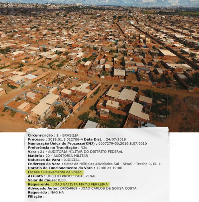 Rolos com a Justiça têm sido uma tradição familiar. João Batista Firmo Ferreira, sargento aposentado da Polícia Militar de Brasília, foi um dos poucos familiares de Michelle convidados para a cerimônia de posse do presidente Bolsonaro. É — ou era — o tio preferido da primeira-dama. Em maio passado, no entanto, ele foi preso, sob a acusação de fazer parte de uma milícia que age na Sol Nascente, onde mora com a mãe, Maria Aparecida, a avó de Michelle. De acordo com o Ministério Público, João Batista e mais sete PMs participariam de um esquema ilegal de venda de lotes na favela. Um delator contou que os policiais atuavam como o braço armado da quadrilha, dando suporte ao negócio irregular através de ameaças e até eliminação de desafetos. O sargento está preso na penitenciária da Papuda, em Brasília.
