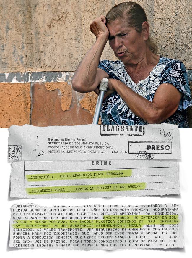Pois o que parecia um desprezo profundo da primeira-dama com a família de origem humilde esconde, na verdade, problemas bem mais complexos. Dona Aparecida, a avó, nem sempre foi a pessoa de saúde frágil e indefesa que hoje cobra um pouco de atenção da neta. Antes de se aposentar, ela tentou ganhar a vida traficando drogas. VEJA localizou nos arquivos da 1ª Vara de Entorpecentes e Contravenções Penais do Distrito Federal o processo que detalha o dia em que Maria Aparecida Firmo Ferreira, então com 55 anos, foi presa em flagrante. Em 1997, a avó da primeira-dama era conhecida nas ruas como “Tia” e, segundo a polícia, sua principal atividade era vender drogas no centro de Brasília. Em julho daquele ano, ela foi surpreendida com 169 “cabecinhas de merla”, um subproduto da cocaína. No auto de prisão, ao qual VEJA teve acesso, os policiais contaram ter recebido uma denúncia anônima de tráfico numa região que fica a apenas 3 quilômetros do Palácio do Planalto. Ao chegarem ao local indicado, eles encontraram Aparecida. Dentro de uma sacola que ela carregava, além da “merla”, estavam dois relógios e dezesseis vales-transporte. Na delegacia, ela confessou o crime.