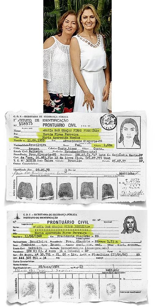 Na reportagem publicada em abril, Maria Aparecida contou ter ajudado a criar Michelle, reclamou da ausência da neta e lamentava não ter sido sequer convidada para a cerimônia de posse do presidente Bolsonaro — nem ela nem a filha, Maria das Graças, a mãe de Michelle. O passado, confidencia um familiar da primeira-dama, também deixou marcas na relação entre mãe e filha. Maria das Graças igualmente esteve na mira da Justiça. Em 1988, quando Michele tinha 6 anos, a polícia descobriu que sua mãe possuía dois registros civis — um verdadeiro e o outro falso. De acordo com o primeiro, o verdadeiro, Maria das Graças Firmo Ferreira nasceu no dia 11 de junho de 1959, tinha 1,60 metro e era filha de Ibraim Firmo Ferreira. No outro, o falso, não havia o nome do pai, o da mãe fora alterado (de Maria Aparecida Mendes para Maria Aparecida Firmo Ferreira), ela ficara nove anos mais nova (o ano de nascimento passou para 1968) e sua altura tinha aumentado em 13 centímetros (1,73 metro). Tratava-se, portanto, de outra pessoa.