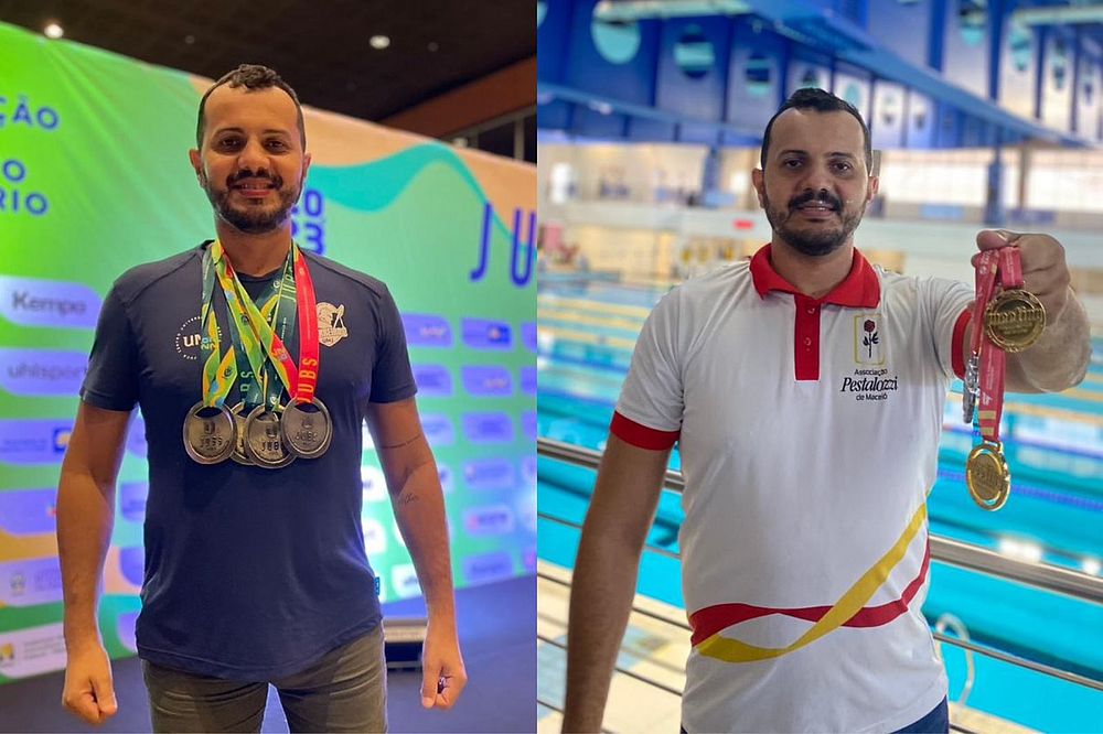 ![]() O paratleta alagoano Júnior Alexandre com medalhas conquistadas em competições de natação |