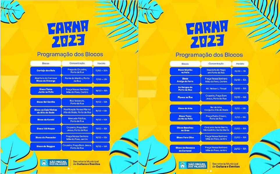 O Carnaval portocalvense contará com desfile de blocos, orquestras de frevo, shows musicais e o tradicional mela-mela, entre os dias 18 e 22 de fevereiro como o tradicional Bacalhau na Vara