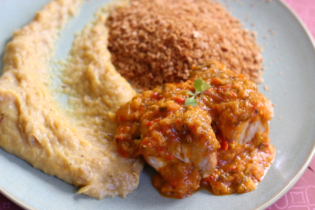Na cozinha dos alagoanos, o peixe do dia pode ser cioba ou dourado. Eu gosto do dois, pois ambos têm textura macia. Na receita da chef Lícia, o pescado vem com molho de moqueca de legumes. Para acompanhar, purê de banana da terra e uma farofinha (Neston) crocante que surpreende o paladar por não ser doce.