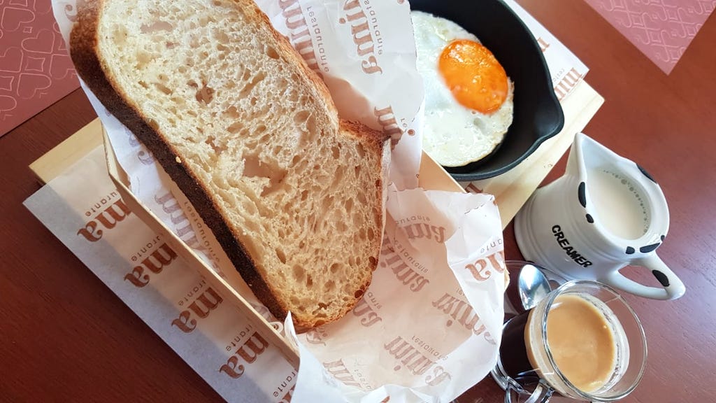 Torrada de fermentação natural com ovo caipira e café com leite