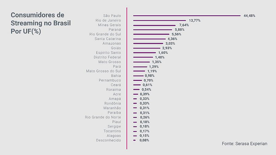 Em Alagoas, o público dos serviços de streaming representa apenas 0,15% dos CPFs cadastrados, sendo assim a unidade da federação que tem o menor consumo do Brasil. Os três estados com maior número no quesito são São Paulo (44,48%), Rio de Janeiro (13,77%) e Minas Gerais (7,64%), conforme a tabela abaixo: