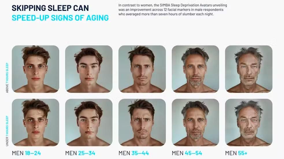 Como as imagens feitas por IA pela empresa indicam (na legenda superior), os efeitos da privação de sono em pessoas mais jovens são mais aparentes.
