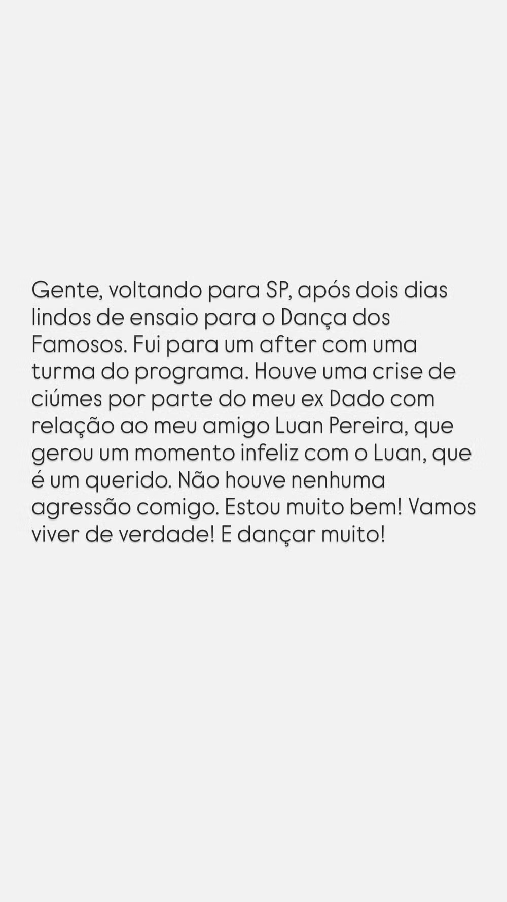 "Gente, voltando para SP, após dois dias lindos de ensaio para o Dança dos Famosos. Fui para um after com uma turma do programa. Houve uma crise de ciúmes por parte do meu ex Dado com relação ao meu amigo Luan Pereira, que gerou um momento infeliz com o Luan, que é um querido. Não houve nenhuma agressão comigo. Estou muito bem! Vamos viver de verdade! E dançar muito!", declarou.