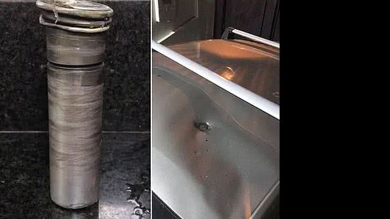 O bancário explica que, no dia seguinte ao aparecimento da peça, a esposa dele foi ver o objeto e notou que o metal estava com cheiro bastante forte. "A ponta estava amassada, com um óleo preto saindo. Além disso, tinha um cheiro podre de ovo".