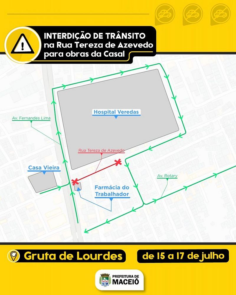 A partir desta quarta-feira (15), a Companhia de Saneamento de Alagoas (Casal) realizará uma obra na Rua Tereza de Azevedo, no bairro da Gruta de Lourdes. Devido à execução do serviço, um trecho da via será temporariamente bloqueado para o tráfego de veículos. Agentes da Superintendência Municipal de Transportes e Trânsito (SMTT) estarão no local para melhor orientar os condutores.