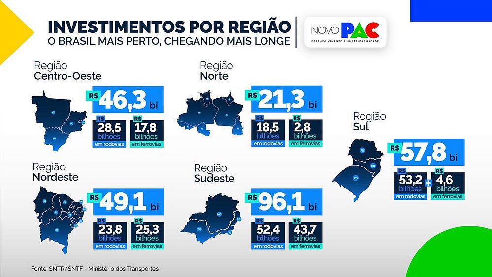 O maior volume de recursos está no Sudeste, R$ 96,1 bilhão, sendo a maior parte em investimentos de concessões existentes e novos editais previstos, como é o caso da BR-381/MG, de Belo Horizonte a Governador Valadares, com leilão marcado para 24 de novembro; e a concessão da BR-040, no trecho que liga o Rio de Janeiro (RJ) a Juiz de Fora (MG).