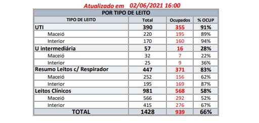 Segundo o relatório de hoje da Secretaria do Estado da Saúde (Sesau), dos 390 leitos disponibilizados em Alagoas, 355 estão com pacientes internados. O relatório indica que há apenas 10 leitos vagos no interior e 25 na capital.