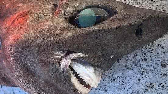 Um pescador australiano capturou um tubarão raro que vive no fundo do mar. Assim que ele compartilhou uma foto do animal, nesta segunda-feira, a imagem tem ingrigado quem vê o bicho de dentes salientes e olhos grandes.