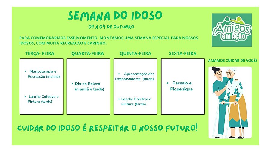 No próximo dia 1º de outubro é celebrado o Dia Internacional do Idoso. Pensando nisso, a associação Amigos em Ação realizará uma programação especial, a partir da próxima terça (1º) até a sexta (04), recheada de atividades para comemorar a Semana do Idoso, nos turnos da manhã e tarde.