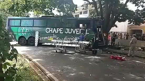 Pela gravação de André Almenara, que fez uma transmissão ao vivo no Facebook, da pra ver o motorista sendo socorrido pelos Bombeiros e deixando o local com vida. O ônibus estava com o logo da Chapecoense a frase “Chape Juvenil” estampada na lateral. Aparentemente o piloto perdeu o controle do veículo na curva e bateu de frente numa árvore.