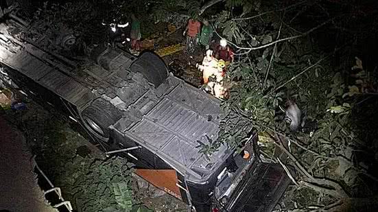 Após a queda, o ônibus capotou e caiu de cabeça para baixo próximo a um riacho. A causa do acidente e as circunstâncias ainda estão sendo investigadas.