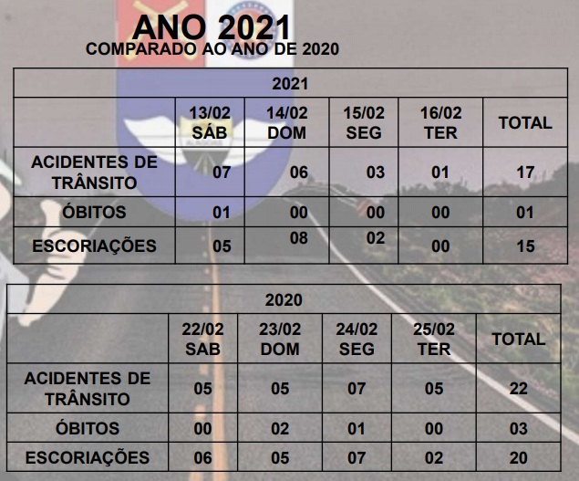 Todos os índices apontam queda em comparação ao Carnaval de 2020, quando houve 22 acidentes, três óbitos e 20 feridos.