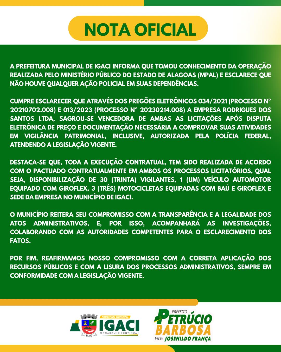 Em nota, a prefeitura de Igaci nega que não houve licitação para contratação da empresa, além de reiterar o compromisso com a transparência. Leia abaixo: