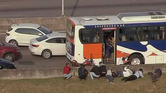 Imagens da TV Globo mostraram passsageiros descendo de um ônibus para fugir do confronto. Políciais que estão no local aparecem correndo na via enquanto trocam tiros com criminosos. Eles também tentam se proteger em muretas.