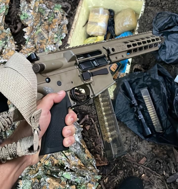 Até o momento, foi apreendida uma carabina calibre 9mm, diversas munições e uma quantidade de entorpecentes. Todo o material foi encaminhado para os procedimentos legais cabíveis. Confira: