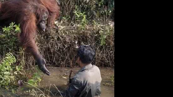 A foto de um orangotango oferecendo a mão para retirar um homem de dentro de um lago infestado por cobras viralizou nas redes sociais.