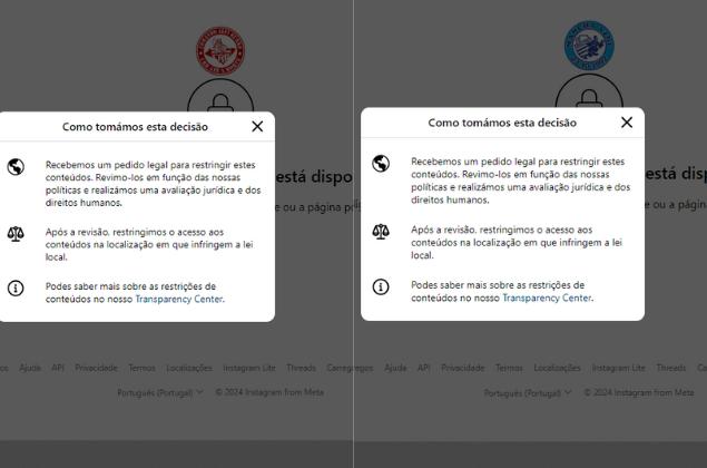 Até o momento desta matéria, os perfis oficiais do Comando Vermelho e Mancha Azul no Instagram seguem bloqueados. Ao tentar acessar qualquer um deles, é possível ver a suspensão dos perfis e a justificativa dada pela rede social. Veja: